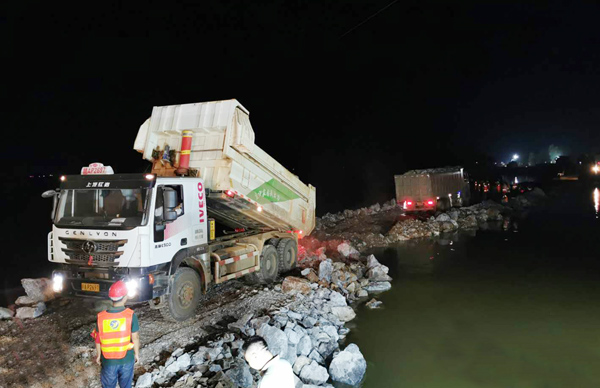 7月13日下午,公司完成封堵工作技術測量和封堵工作技術方案制定,7月13日晚上,搶險技術、施工人員及設備陸續進場,并調配塊石、砂礫石等各類材料進場。決口封堵采取南北兩岸同時進占方式施工, 7月14日中午14時開始進占施工,經過兩天兩夜連續55個小時施工作業,于7月16日晚上21時43分,完成決口合攏,比預計完工時間提前50小時。